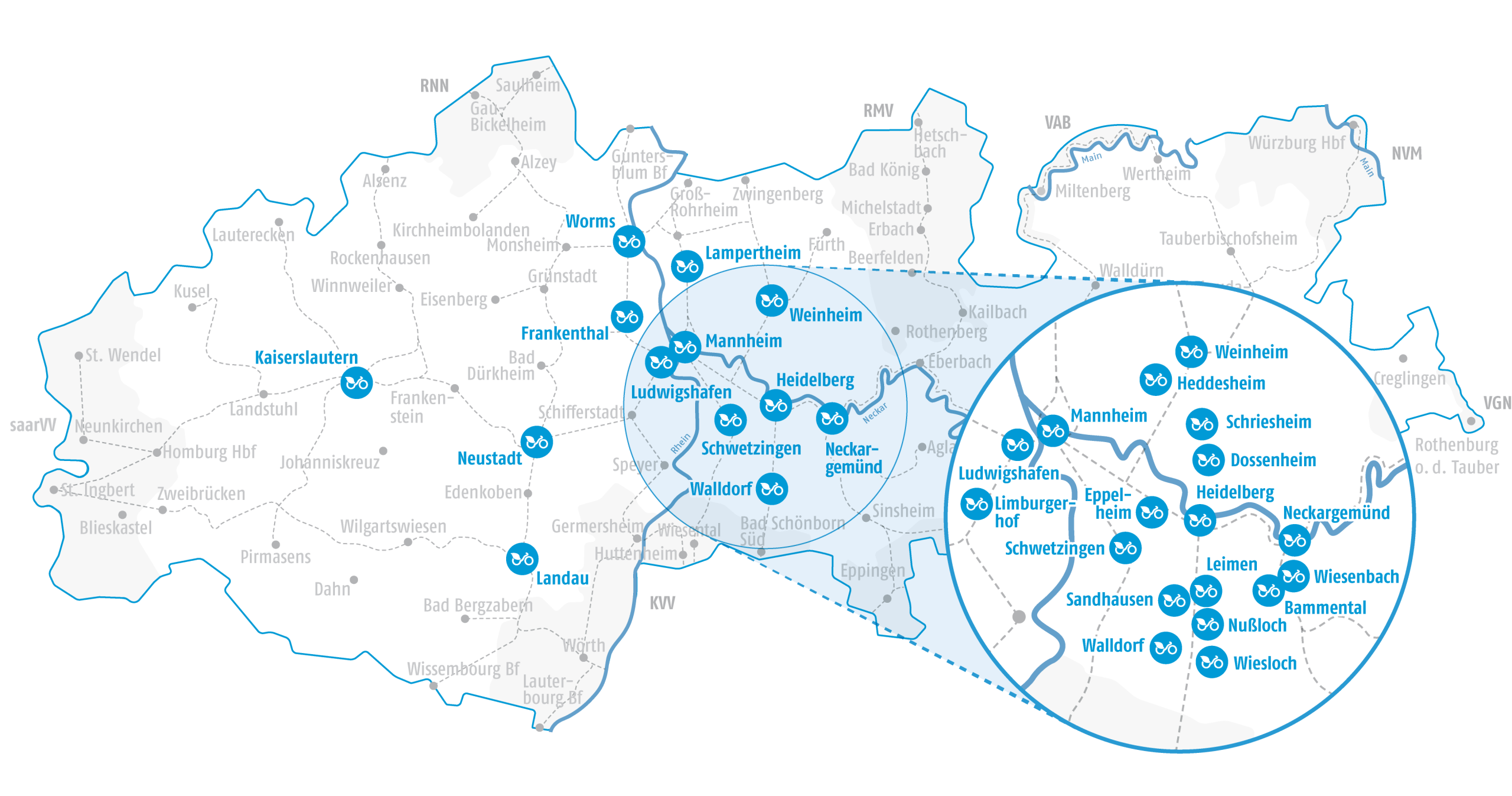 Unsere Fahrräder können städteübergreifend in über 20 Kommunen des Verkehrsverbunds Rhein-Neckar ausgeliehen und zurückgegeben werden.